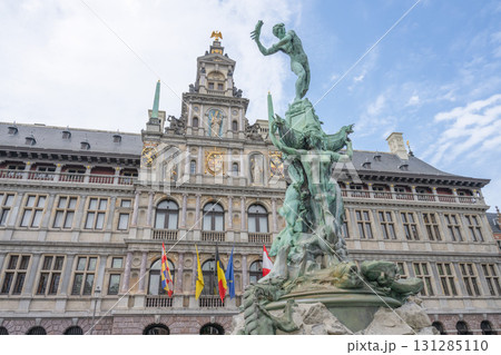 Brabo Fountain sculpture in front of the City Hall in the Grote Markt main square of Antwerp, Belgium