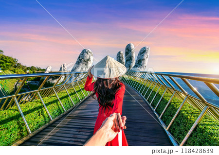 Women tourist holding man's hand and leading him to Golden bridge in Da nang, Vietnam.