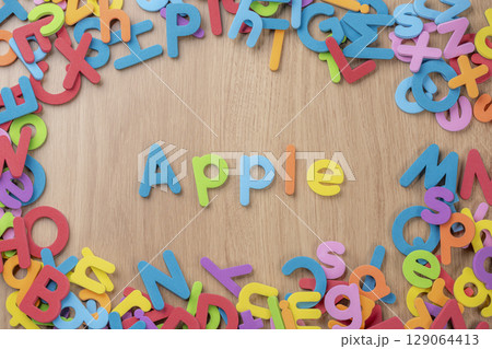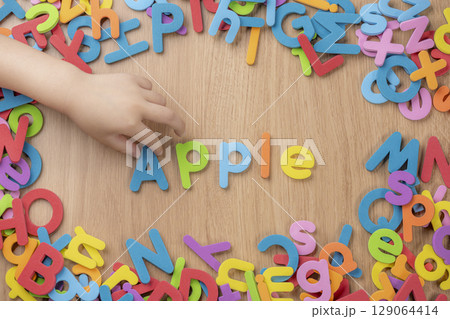 カラフルなアルファベットの英単語Appleを並べる子供の手