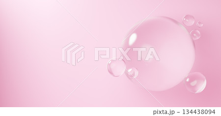 ピンクの背景に浮かぶ複数の水の球体。水滴。コピースペース。3D(横長)