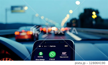 Smartphone resting on car dashboard displaying messaging interface, blurred highway backdrop revealing dangers of distracted driving during twilight hours