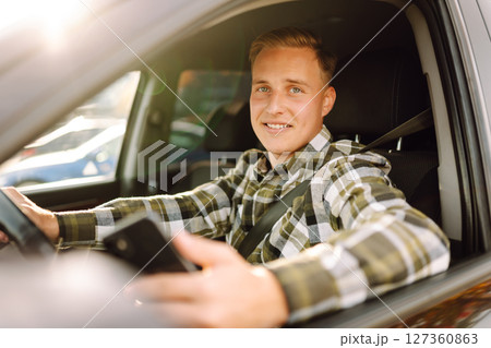 Smiling man using smartphone sitting on driver's seat in car. Car travel, lifestyle concept.
