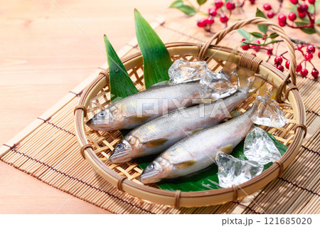 笊にのせた天然の鮎( 和歌山県 古座川産 天然アユ ) 郷土料理