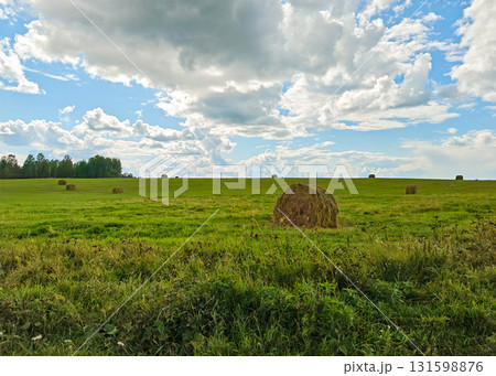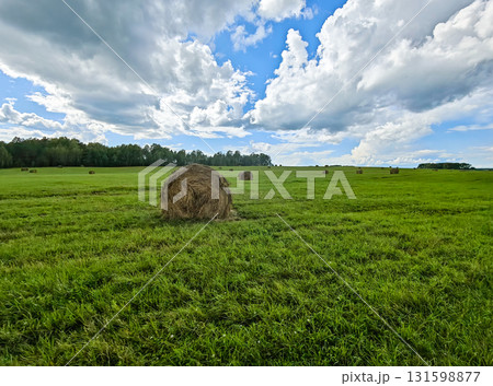 Hay bale on green field under dramatic clouds and blue sky, rural landscape, summer day