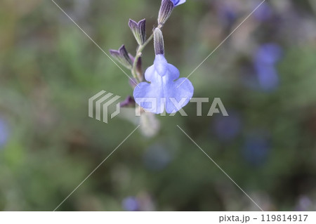 秋の庭に咲く水色のサルビア・アズレアの花