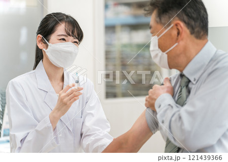 ワクチン・注射を打つ女性医師とシニアの男性患者