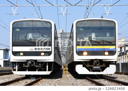 電留線で並ぶ外房線表示の209系(B.B.BASE)と209系2100番台