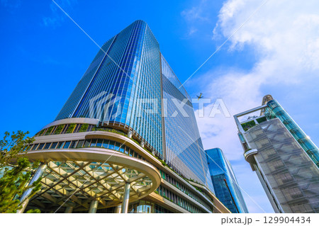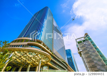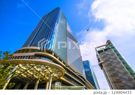 日本の東京都市景観 珍景航空機通過…猛烈な暑さ、発達した雲が高輪ゲートウェイシティ上空に=8月21日