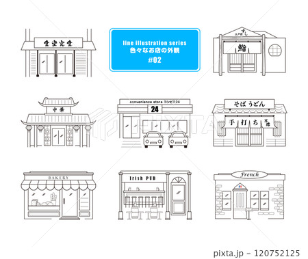 色々なお店の外観をイメージした線画イラストセット|食堂・寿司屋・中華店・コンビニ・そば屋・うどん屋・