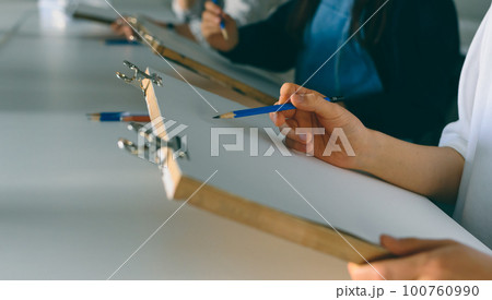 目玉クリップでB3パネルに画用紙を止めてデッサンをする女子