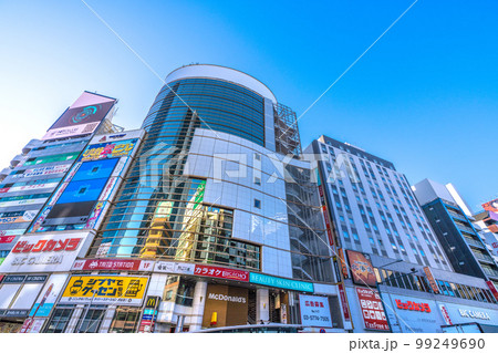 日本の東京都市景観 渋谷の宮益坂下交差点から商業ビルやビックカメラ、ホテルなどを望む