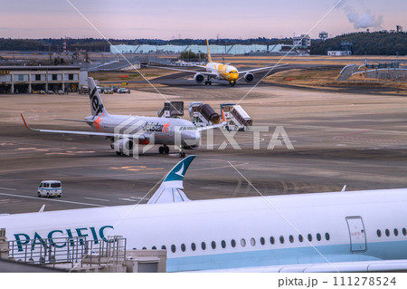 日本の千葉都市景観 成田空港第2からキャセイパシフィック航空、ジェットスター、スクートなどを望む