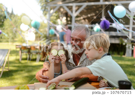 Grandfather and grandchildren having fun at a garden barbecue. Granddauhter putting cucumber slices on her eyes.
