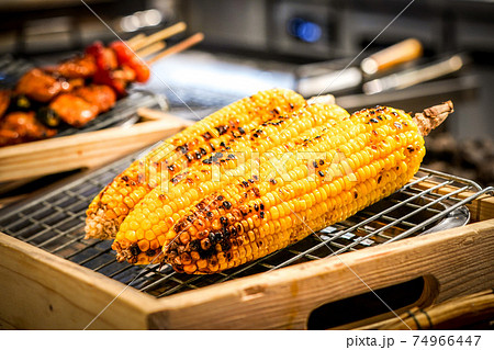 grilled corn on the grill with blur BBQ beside.
