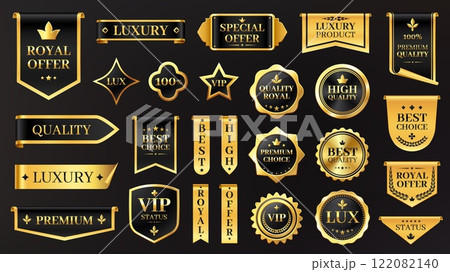 Premium golden label. Luxury quality badges and sale stickers for product packaging, exclusive shiny gold ribbon and stamp icons. Vector glossy certificate seal collection