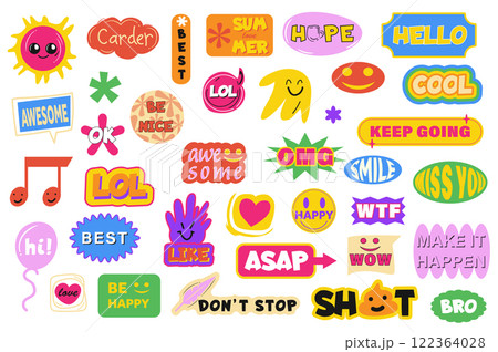 Colourful comic vintage label set in flat graphic design. Collection elements of funky 90s, 80s stickers with hello, cool, hope, smile, best, like, awesome and other messages. Vector illustration.