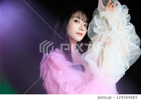 暗い背景でドレスを着た若い女性の高級感のある美容ファッションポートレート