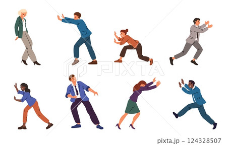 Men and women pushing in different poses. People press with efforts. Strength action. Hard work. Persons pulling and prodding blocks. Power and persistence. Vector move positions set