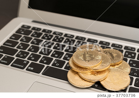 Bitcoin gold coins with laptop keyboard. Virtual cryptocurrency concept.