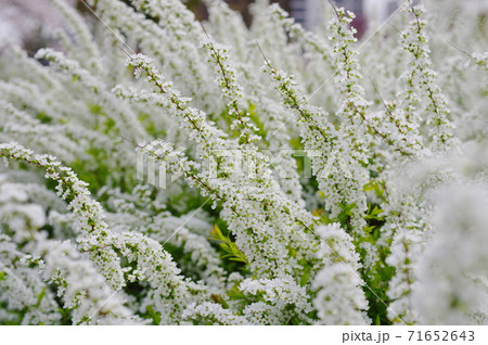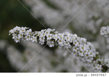 日本の春の庭に咲くユキヤナギの白い花