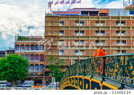 Monk crossing the river Chinatown area of Bangkok