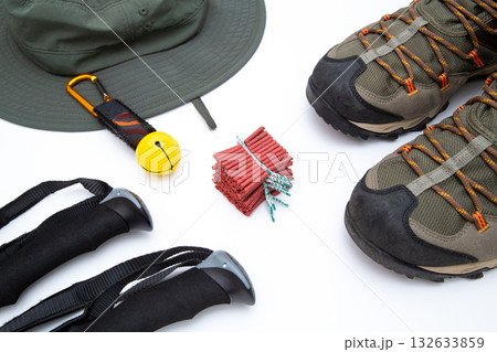 クマ鈴と爆竹(トレッキングポール、登山靴、帽子)