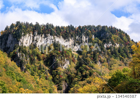 層雲峡の断崖を彩る秋の紅葉と青空|阿寒摩周国立公園