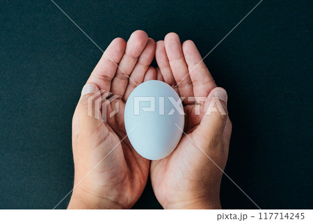 手のひらに卵をのせる小学生の男の子