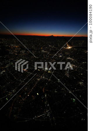 飛行機の窓から観る東京の夜景と富士山と日暮れ