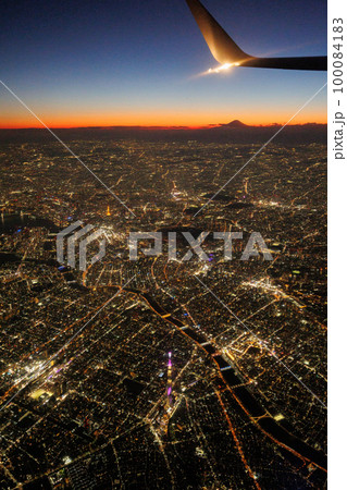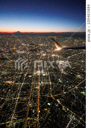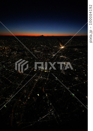 飛行機の窓から観る東京の夜景と富士山(黄昏時)