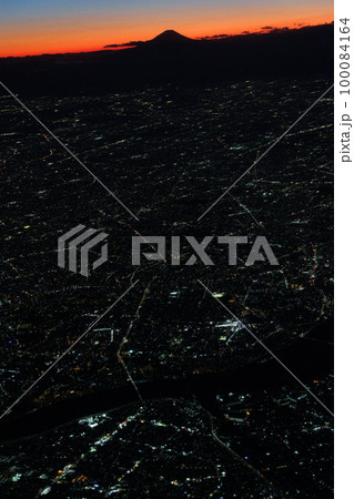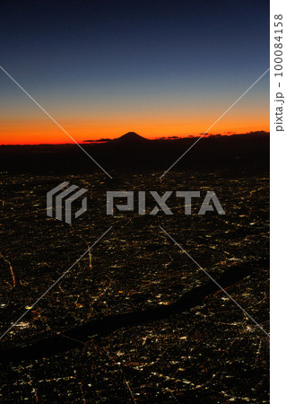 飛行機から観る東京の夜景と富士山(日没直後)縦構図