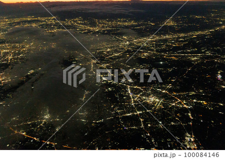 飛行機の窓から観る東京の夜景と雲(日没直後)