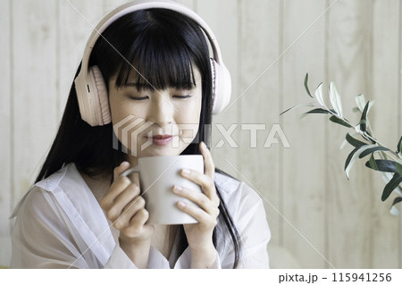 ヘッドフォンで音楽を聴きながらリラックスする若い女性