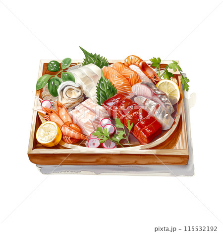 白背景に新鮮なお刺身の舟盛りの水彩イラスト