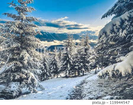 Snowy path is winding through snow covered pine trees with a view of the snow capped carpathian mountains of ukraine in the distance