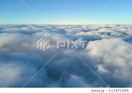 Aerial view from above at high altitude of dense puffy cumulus clouds flying in evening. Amazing sunset from airplane window point of view
