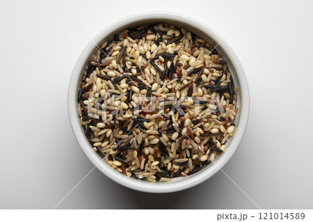 White and red raw rice grains in a ceramic bowl. Rice as an ingredient