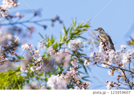 満開の桜の中のヒヨドリ