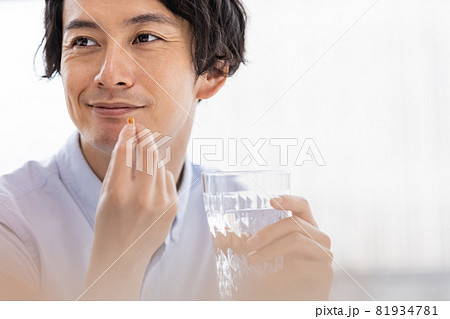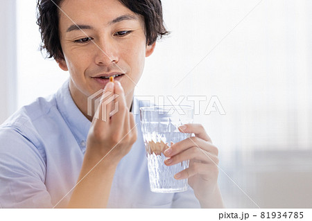 カプセル剤を水で飲もうとする男性