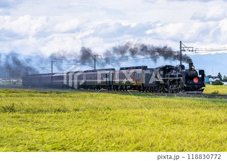 収穫間際の稲穂とSLばんえつ物語 福島県会津若松市