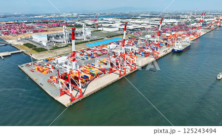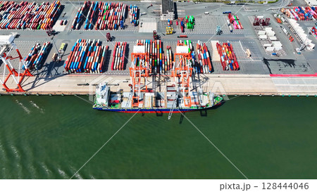 貨物の置かれた埠頭の真俯瞰ドローン空撮