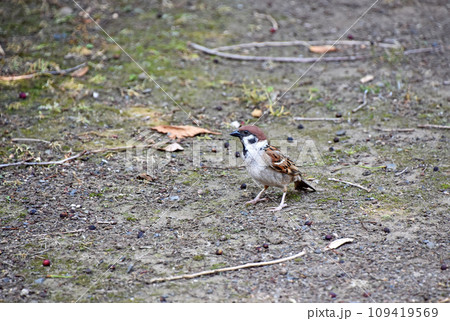 道の真ん中で食餌しているスズメ