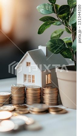 Stacks of coins supporting a miniature house model represent the concept of real estate investment, mortgage, and financial growth, with a small potted plant adding a touch of sustainable living