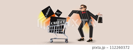 Banner. Contemporary art collage. Man in painted formal suit with long arms and legs rolls cart with cubes with word 'credit'.