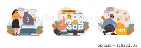 Student debt set. Young graduated character with a financial crisis. Expencive education loan. Payment problem after a graduation. Flat vector illustration