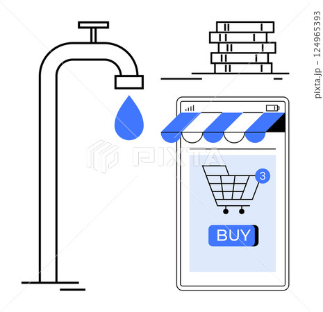 Faucet dripping water, stacked coins, mobile device with shopping cart and buy button highlight concepts of e-commerce, online shopping, financial management, convenience, and modern lifestyle