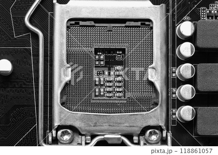 Old black motherboard of computer equipment focusing on CPU slot background, Technology background.