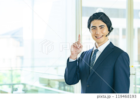 オフィスビルでヘッドセットをつけて案内する男性ビジネスパーソン