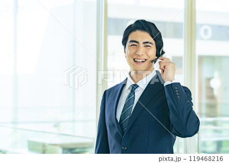 オフィスビルでヘッドセットを使って会話する男性ビジネスパーソン