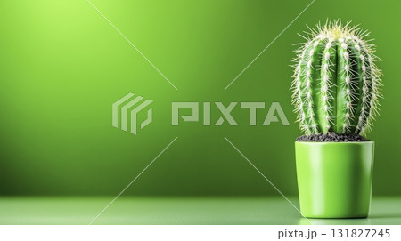 Bright Green Cactus in Modern Pot Against Vibrant Green Background for Nature and Home Decor